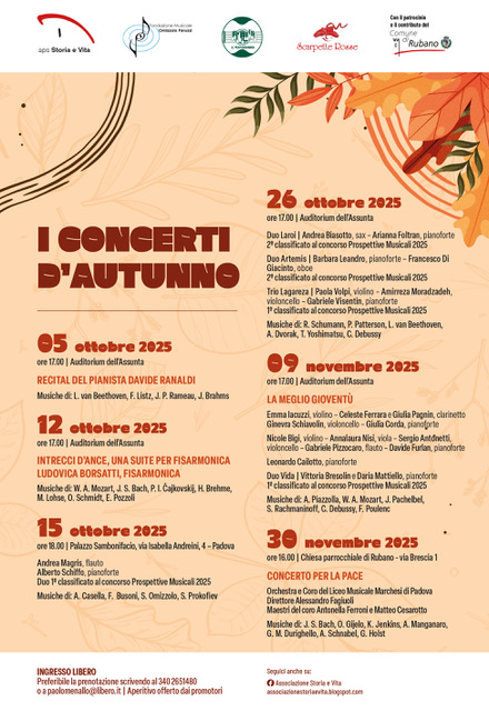 APS Associazione Storia e Vita organizza l’evento dal titolo “Concerti d’autunno 2025” che giunge quest’anno alla XI^ edizione; un ciclo di sei concerti offerti gratuitamente alla cittadinanza tra i mesi di ottobre e novembre con lo scopo di valorizzare e sostenere i giovani talenti.