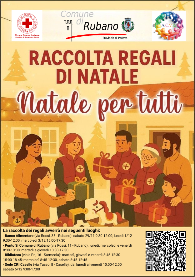Fa parte delle iniziative del Natale anche il Progetto "Natale per tutti": un’iniziativa di Solidarietà per i bambini con l'obiettivo è raccogliere regali di Natale da donare ai bambini di famiglie in diccoltà del territorio, rendendo le loro festività più gioiose. Tutti i dettagli sul sito del Comune: www.comune.rubano.pd.it/it/news/natale-per-tutti-un-iniziativa-di-solidarieta-per-i-bambini
