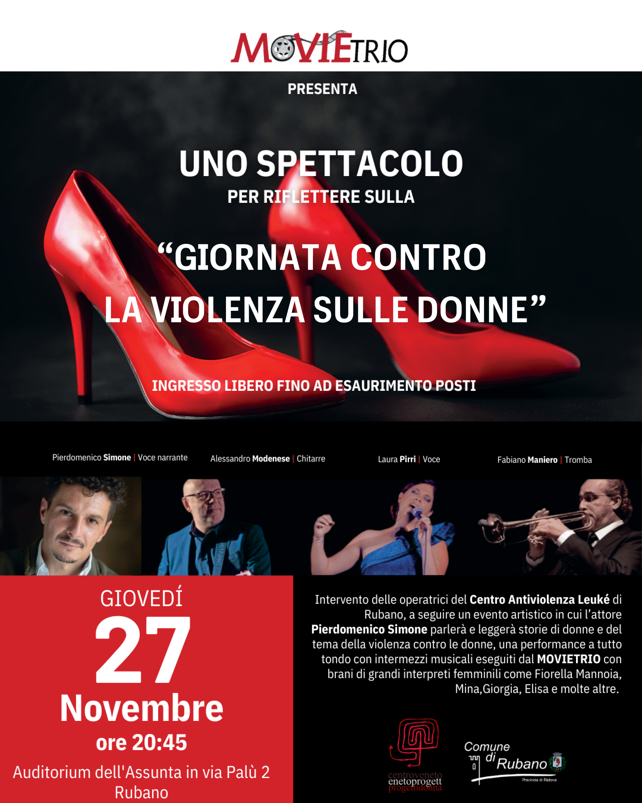 Previsto l'intervento delle operatrici del Centro Antiviolenza Leukè di Rubano e, a seguire, un evento artistico in cui l'attore Pierdomenico Simone parlerà e leggerà storie di donne e del tema della violenza di genere, una performance a tutto tondo con intermezzi musicali eseguiti da MOVIETRIO con brani di grandi interpreti femminili come Fiorella Mannoia, Mina, Giorgia, Elisa e molte altre.