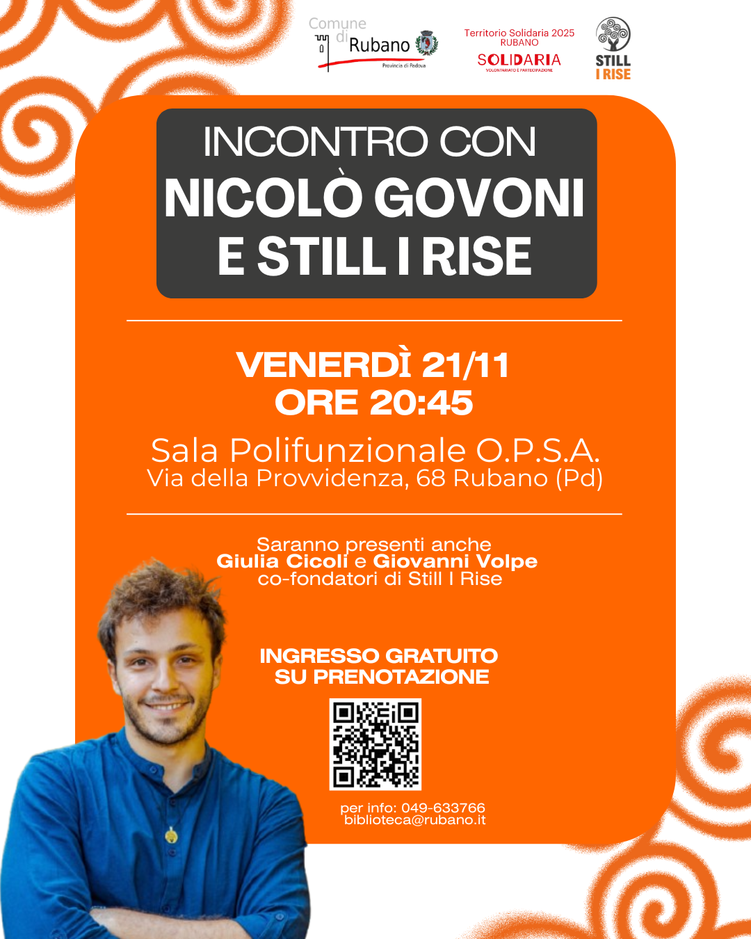 Venerdì 21 novembre alle 20:45 all'Opera della Provvidenza di Sant'Antonio si terrà un incontro gratuito aperto alla cittadinanza con Nicolò Govoni, presidente e fondatore di Still I Rise, organizzazione umanitaria indipendente fondata nel 2018 per portare istruzione d’eccellenza a bambini profughi e vulnerabili nel mondo. Insieme a Nicolò Govoni ci saranno anche i cofondatori di Still I Rise Giulia Cicoli e Giovanni Volpe.