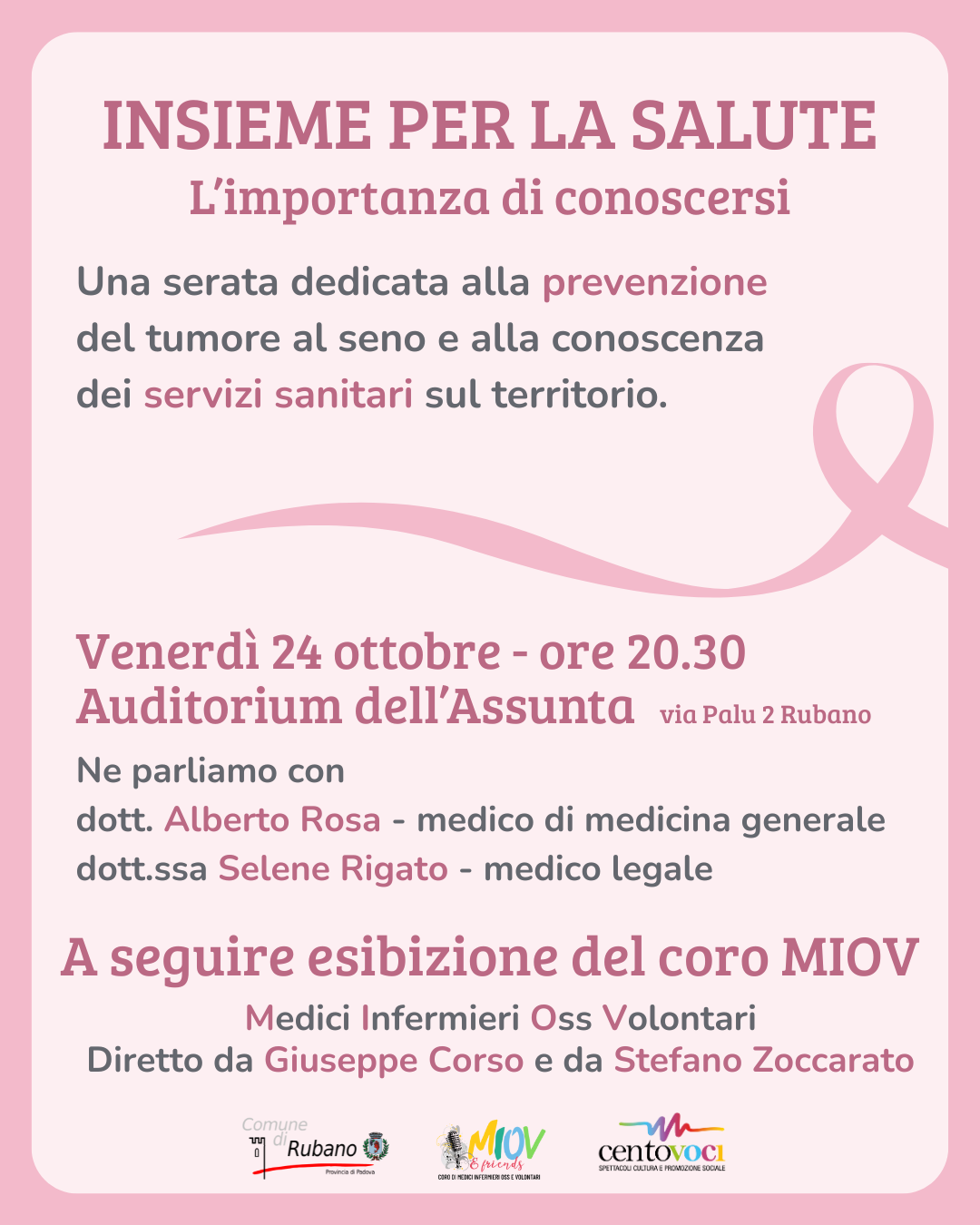 Il Comune di Rubano invita la cittadinanza a partecipare alla serata "Insieme per la salute. L'importanza di conoscersi" dedicata alla prevenzione del tumore al seno e alla conoscenza dei servizi sanitari del territorio venerdì 24 ottobre alle 20:30 all'Auditorium dell'Assunta (via Palù 2, Rubano) organizzata nell'ambito del mese della prevenzione.
