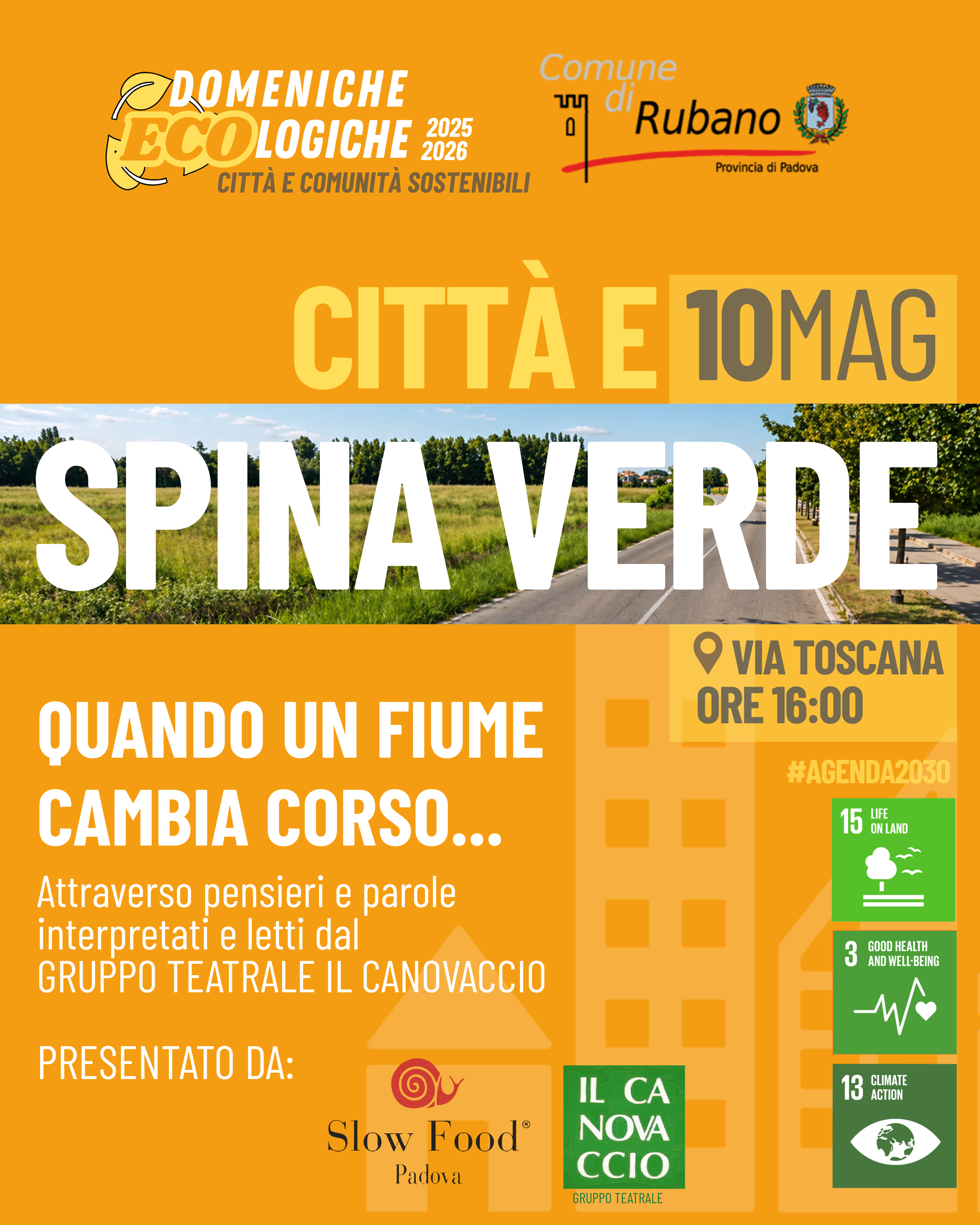 Domenica 10 maggio in via Toscana a partire dalle 16 la cittadinanza è inviata a partecipare all'iniziativa promossa da Slow Food in collaborazione con il gruppo teatrale “Il Canovaccio”, nell'ambito delle Domeniche Ecologiche 2025/2026: "Quando un fiume cambia corso..."