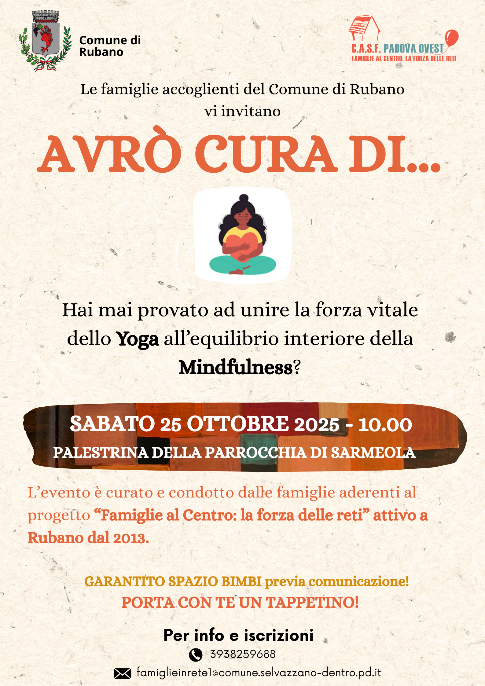 Le famiglie aderenti al progetto "Famiglie al Centro: la forza delle reti" attivo a Rubano dal 2013 invitano all'evento "Avrò cura di..." sabato 25 ottobre alle 10 nella palestrina della Parrocchia di Sarmeola.
