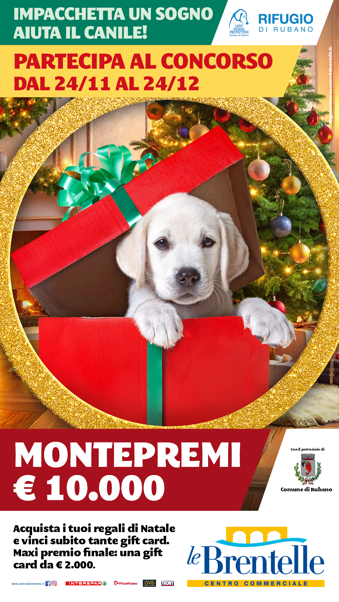 Dal 24 novembre al 24 dicembre al Centro Commerciale Le Brentelle di Rubano, A&A Centri commerciali SRL ha predisposto una postazione con volontari che confezioneranno i regali di Natale acquistati presso i vari negozi. L’attività è abbinata ad un concorso: ogni pacco confezionato darà diritto a vincere dei premi giornalieri oltre che al maxi-premio finale di una gift card da 2mila euro a fronte di una donazione spontanea a favore del Canile di Rubano.