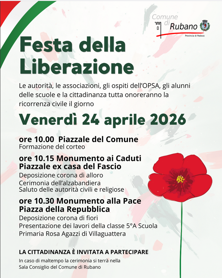 Venerdì 24 aprile 2026 il Comune di Rubano onorerà la ricorrenza civile della "Festa della Liberazione" con una cerimonia che vedrà la partecipazione delle Autorià, delle Associazioni del territorio e gli alunni della classe 5A della Scuola primaria Rosa Agazzi di Villaguattera.